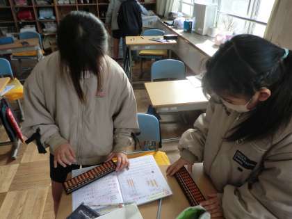 3年生の算数では、これまで学習してきたそろばんの学習のまとめを行いました。問題を終わった子から、みんなにやり方をやさしく教えていました。