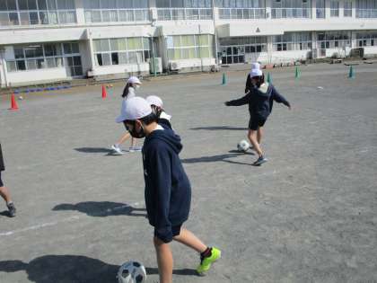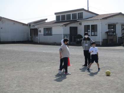 3人でパスをまわして、シュートをする練習です。役割を交代しながら、チームプレーの楽しさを味わっていました。