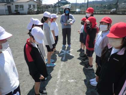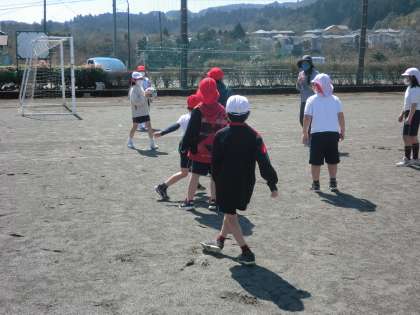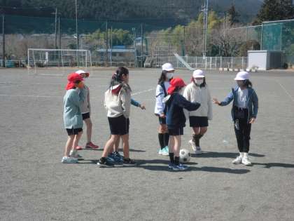 3年生の体育では、ラインサッカーを行いました。左右1名ずついる同じチームのラインマンにパスをしてからでないと、シュートができないというルールがあります。そのため、コートを広く使ってパスをつなげながらゲームを楽しんでいました。