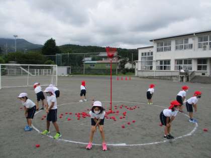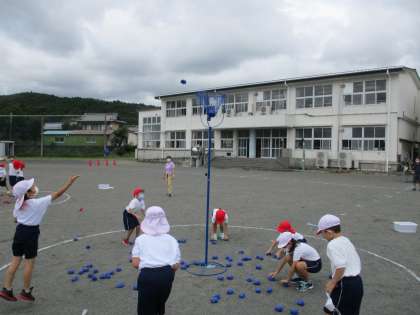 そして、玉入れです。どうしたらたくさん入れられるでしょう?みんな、よく考えながら頑張っています。力を合わせて競い合うのは楽しいですね。