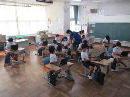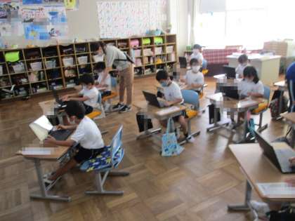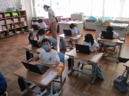 1年生は、QRコードを使ってログインをしていますが、パスワードを設定して、キーボードで入力してログインできるように挑戦しています。アルファベットの大文字、小文字、数字など、学習していないものがたくさん含まれていますが、みんな、意欲的に挑戦しています。凄いです。