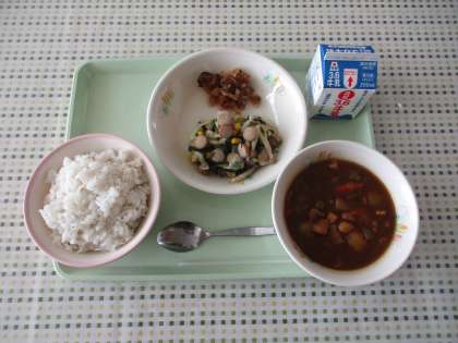 ヒヨコマメは、アジア西方が原産で、インドやヨーロッパに広がったものと考えられています。大きさは普通のダイズと同じくらいで、1個の突起が鳥の頭のような形であることが名前の由来とされています。今日はカレーに使われました。