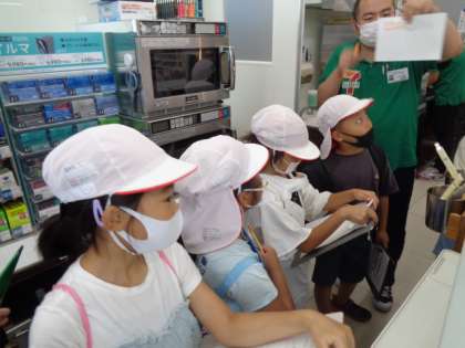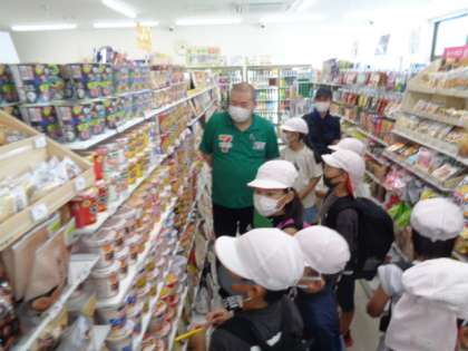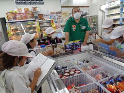 品物の並べ方や販売の仕組みなど お店の工夫について 実際に見たり聞いたりすることができ とてもいい体験になりました。たくさん質問をし メモを取って お店見学を頑張った3年生です。