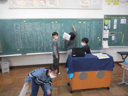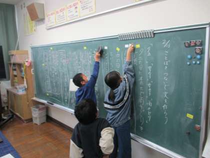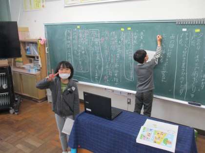 絵の中の言葉を使って、自分で考えて文を作ります。絵に出てくる言葉は、「まん中」「左右」「先生」「名前」「休み時間」「糸電話」「小学校」「夕立」「女の子」「男の子」「雨やどり」です。考えた文を黒板に書き、意見交換をしました。