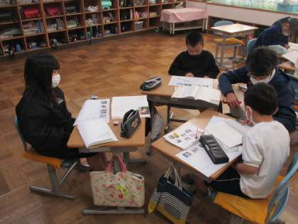 冬眠する動物たちについて、仲間分け表に整理していきます。本文より、動物ごとに「どこで」「どうやって」を読み取り、表に書き込みます。自分なりの考えが持てたところでグループになって、意見交換を行いました。