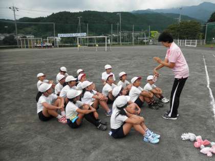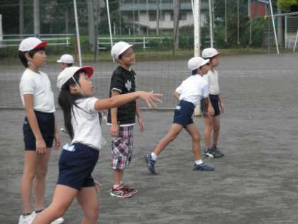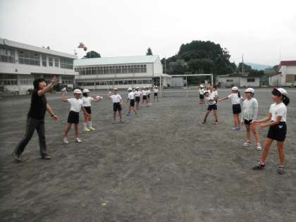 3、4年生は、グランド中央で二組になり、キャッチボールです。