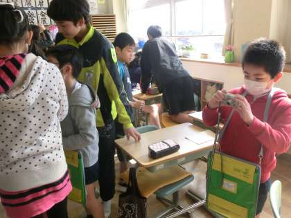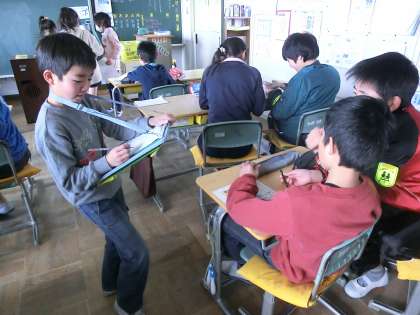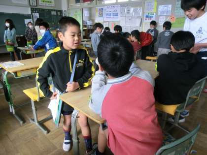 ポスターをつくるために、3年生が6年生の写真を撮ったり、インタビューをしたりしています。