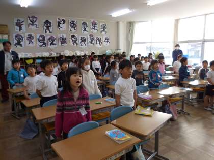 低学年は、元気に校歌から始まりました。欠席なしです。