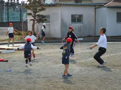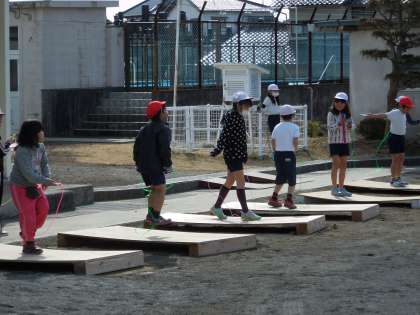 お天気のいい日の中休みは、元気に外へ出る子たちが多いですね。ブームは、縄跳びとサッカーかな。