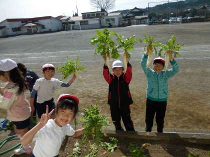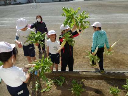 立派な大根ができました。早速、切り干し大根をつくる準備をしました。葉っぱは、教頭先生が「ふりかけ」に変身させてくれ、給食の時においしくいただきました。