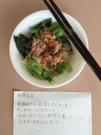 ゆであがった青菜は、おひたしにして食べていました。担任の先生にはもちろん、校長先生や教頭先生、事務室や級外の先生にもお裾分けしてくれました。