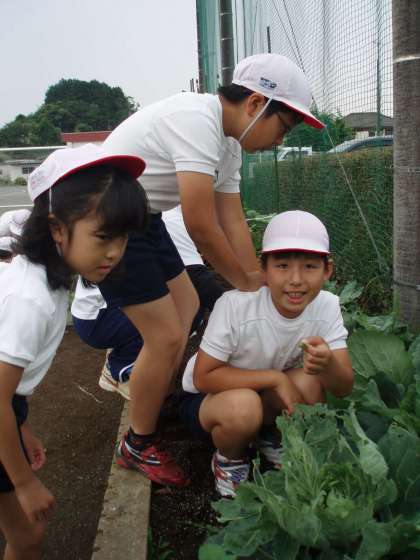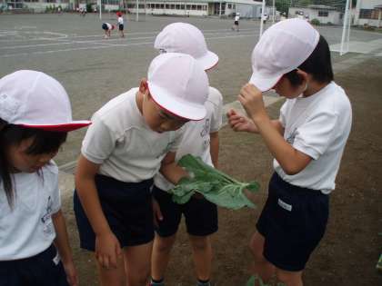 3年生が、花壇のキャベツに集まってきてアオムシ探しが始まりました。