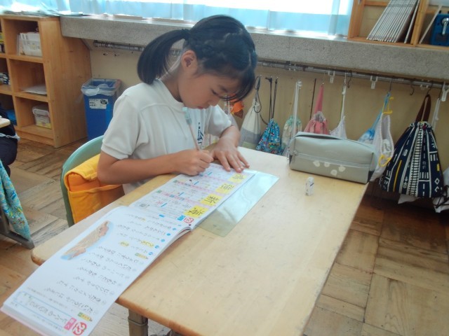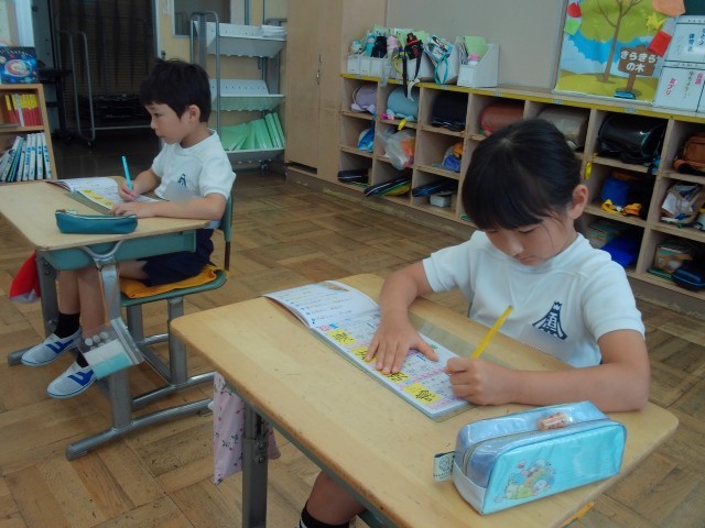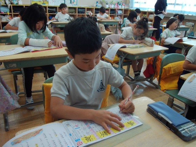 ドリルを使って漢字の練習をしました。2年生の教室をのぞくと、いつもよい姿勢で字を書いています。だからきれいな文字が書けるのですね。