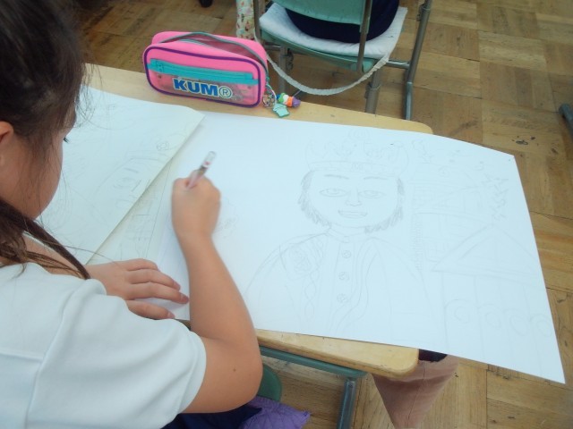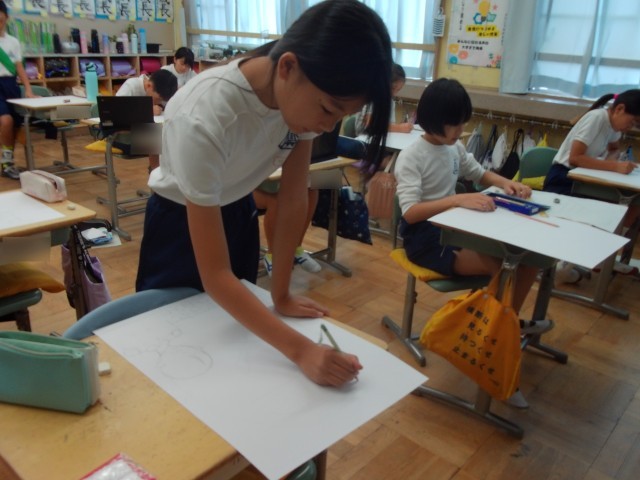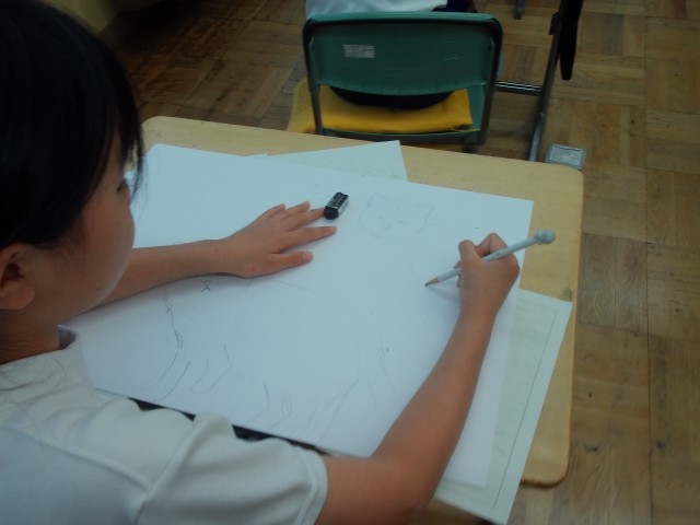 国語の教科書にある物語文を題材にした絵を描き始めました。想像をふくらませながら細かく丁寧に描いています。