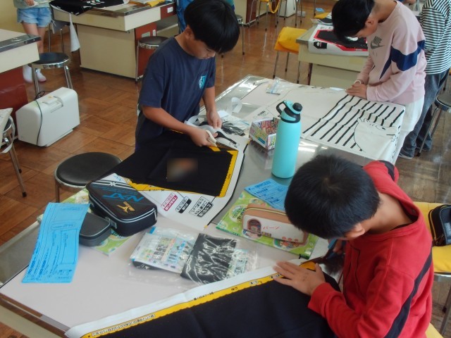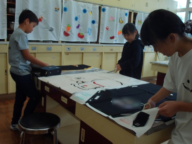 5年生もエプロンづくりにとりかかりました。今日の作業は1時間しかないため、布の裁断が中心となりました。表情は真剣そのものです。