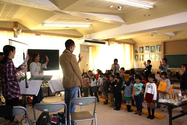 「文化庁 学校における文化芸術鑑賞・体験推進事業」として、風の五重奏団とその仲間たちの皆さんによる“風の合奏団”公演が開催されました。管楽器による素敵な演奏をじっくり鑑賞した後、児童のハンドベルと団員の皆さんの楽器とのコラボ演奏や、楽器の演奏にあわせて歌を歌うなどの体験もさせていただきました。クラリネット、オーボエ、フルート、ファゴット、ホルン、サクソフォンの音色や演奏する様子を間近で鑑賞することができ、子供たちの目は終始輝いていました。風の五重奏団とその仲間たちの皆さん、貴重な経験をありがとうございました。