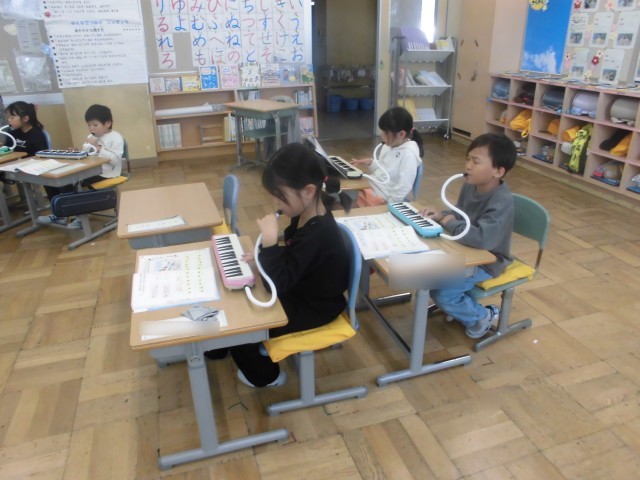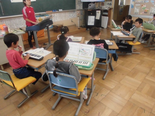 1年生の音楽の学習では、鍵盤ハーモニカで【日の丸】の練習をしていました。