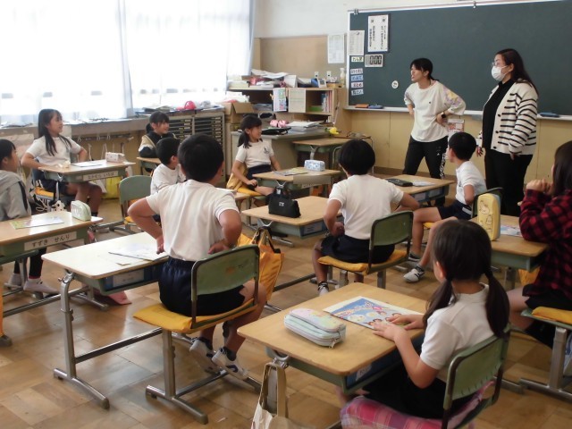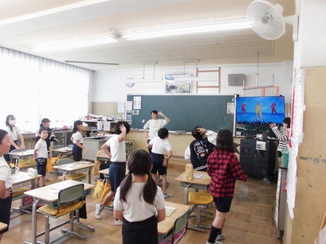 3年生の外国語活動の時間では、みんなで楽しく曲に合わせて楽しそうに体を動かしていました。