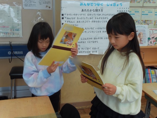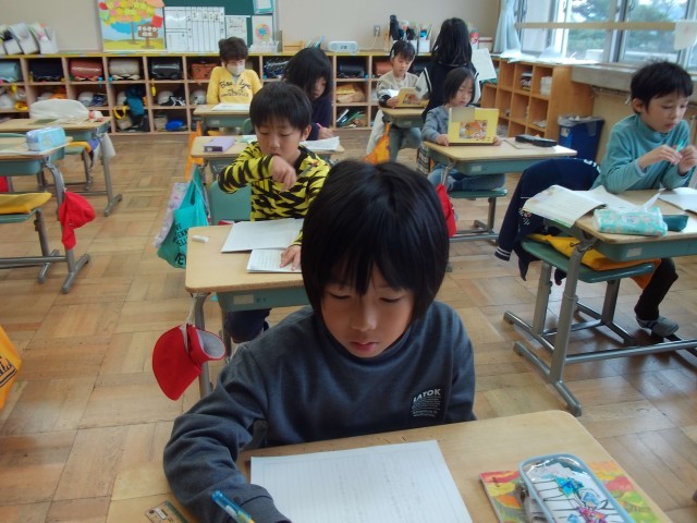 「かさこじぞう」 場面ごとにじいさまの気持ちを想像してみました。友達はどんなことを考えたのか、書けた子から友達のノートを見せてもらいました。(ふむふむ、そんなふうに思ったんだね。)そのような顔をして興味深そうに読んでいます。