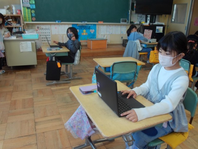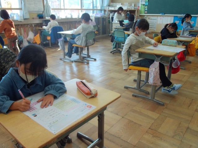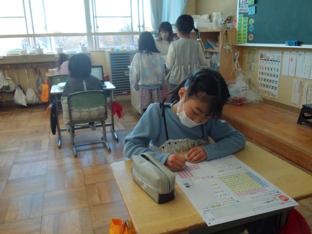 学習発表会でかけ算の場面や九九を立派に紹介した2年生。今日はテストのようです。発表会での経験を生かすことができたかな?早く終わった子は別のプリントやタブレット問題に挑戦していました。