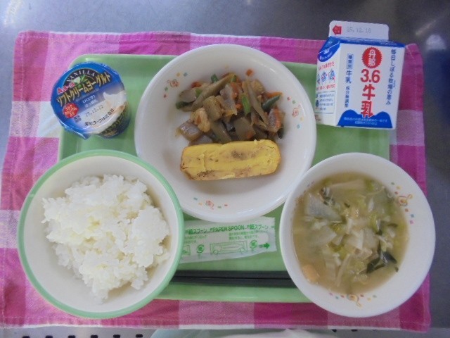 今日の給食 公開日 2025/12/11 更新日 2025/12/11 その他 12月10日(水)~今日の献立~*ごはん*牛乳*ツナ入り厚焼き玉子*鶏ごぼう煮*白菜の味噌汁*ソフトクリームヨーグルト いいね(0)