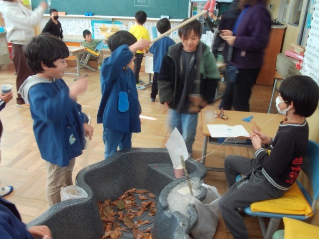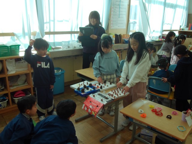 須山幼稚園の園児と1年生が交流会をしました。もてなす側の1年生は前々から準備を進め、わくわくしながらこの日を迎えました。内容は学習発表会で発表した出し物の披露と、秋をテーマにした手作りおもちゃで遊ぶというものです。一生懸命準備や練習をしてきたおかげで、園児のみんなはとても喜んで、終始笑顔を見せてくれました。