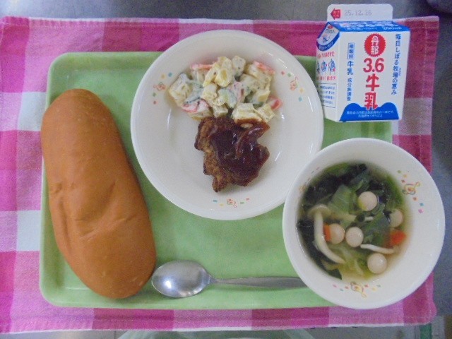 今日の給食 公開日 2025/12/19 更新日 2025/12/19 その他 12月18日(木)~今日の献立~*黒糖入りロールパン*牛乳*もみの木ハンバーグ デミソースがけ*サツマイモサラダ*キャベツスープ今日のさつまいもは、学校で収穫したものを使っています。 いいね(0)