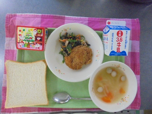 今日の給食 公開日 2025/12/23 更新日 2025/12/23 その他 12月23日(火)~今日の献立~*角型食パン*牛乳*クリスピーチキン*ほうれん草ソテー*コンソメスープ*クリスマスケーキ いいね(0)