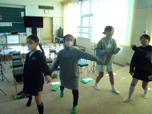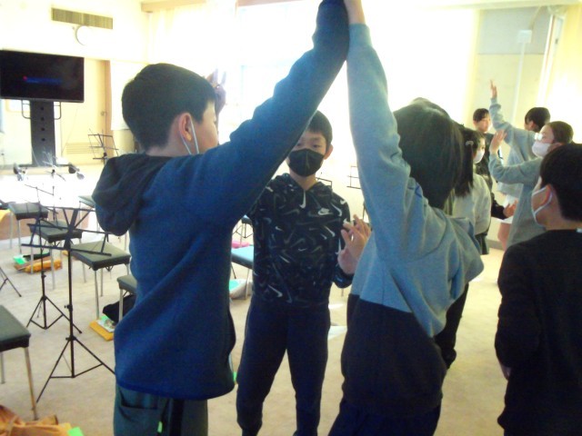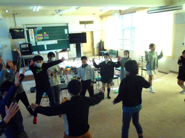 歌を歌いながら体も動かすウォーミングアップになります。腕をぐーっと伸ばすときは綺麗で伸びのある声も出すことを意識するのだそうです。確かに、その動きが加わることでとてもいい声が出ていました。歌うときは体全体を使って表現するというのは大事なことなのですね。
