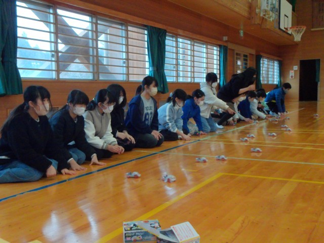 6年理科:手動ハンドルで蓄電した車をみんなで走らせました。