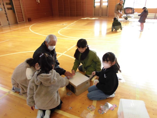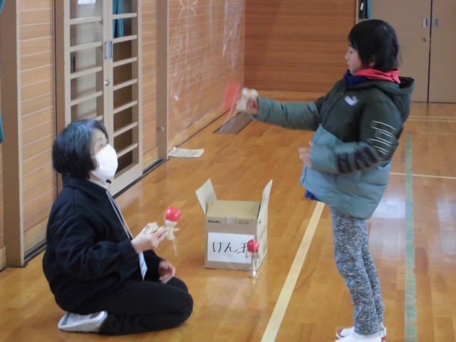 地域の方にご来校いただき、めんこや、羽子板、けん玉、こまなど、