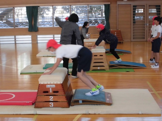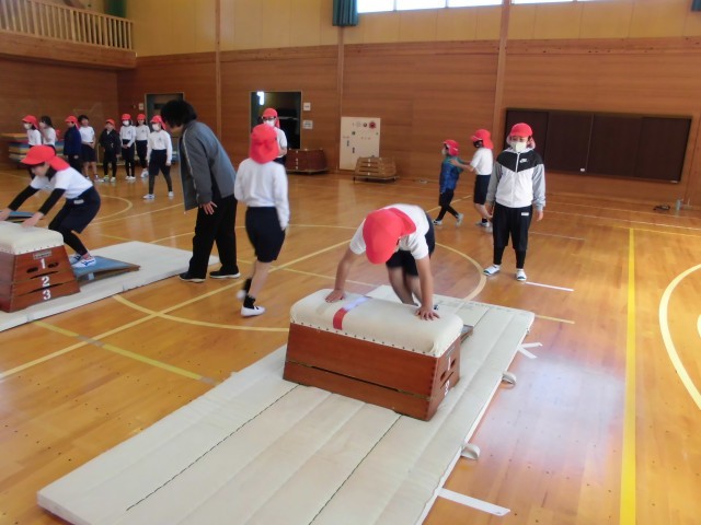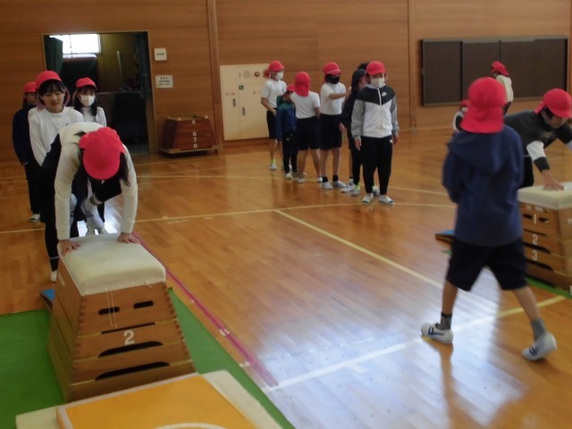 3.4年生の体育の学習では、跳び箱で【かかえこみ跳び】に挑戦していました。