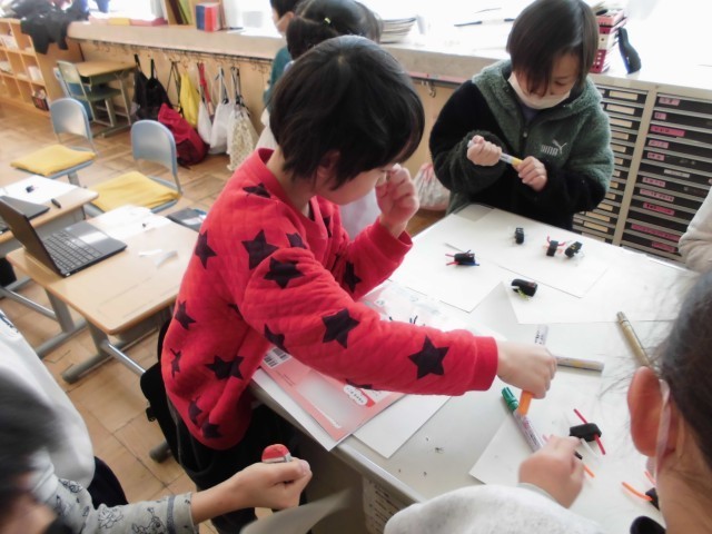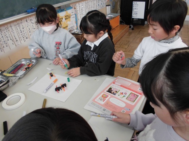 1年生の図工の学習では、【すきまちゃんのすきなすきま】という学習をしていました。