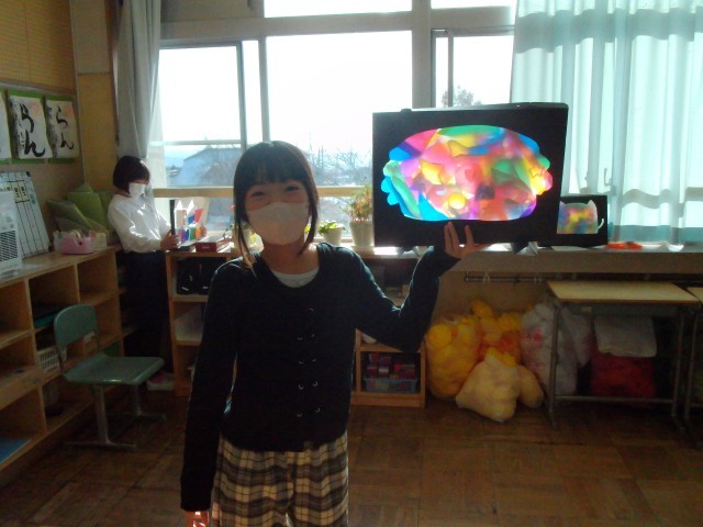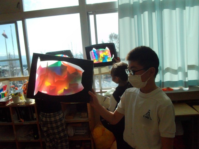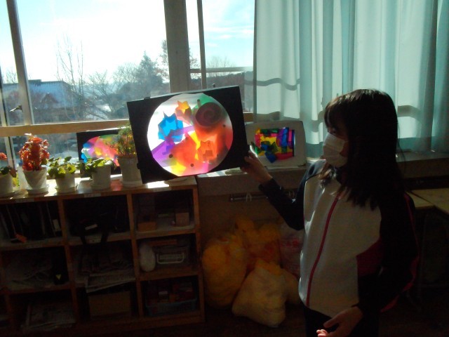 「光のさしこむ絵」 いろいろな色や模様が重なるととても美しいですね。完成した作品を手に「はい、チーズ!」
