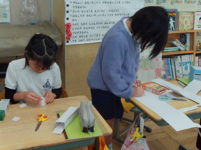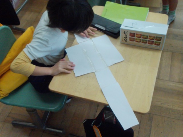 各自持ってきた箱の面を紙に写し、切り取って箱型に組み立てる活動をしました。切り取った面をどう並べ、貼り合わせたら箱の形になるのか、試行錯誤しながら組み立てていきます。この活動を通して箱を構成している面の数や形に着目し、箱の特徴を理解することにつながっていきます。