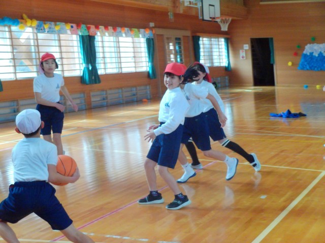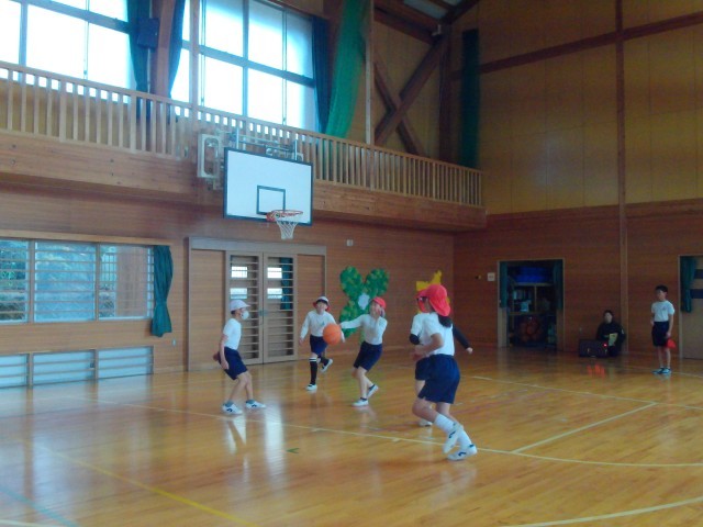コートの半面を使ってゲームをしました。攻撃と守備を交代で行います。どうすればパスがつながりシュートが決まるのか、そのポイントはずばり、チームの作戦にあります。ゲームを通してその答えが見つかりつつあるようです。