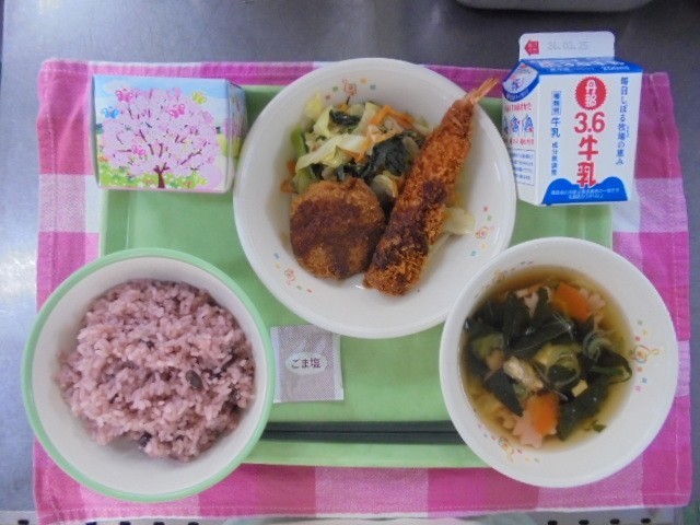今日の給食 公開日 2026/03/18 更新日 2026/03/18 その他 ~今日の献立~3月17日(火)*お赤飯(ゴマ塩)*牛乳*ミックスフライ(ヒレカツ・エビフライ)*和風野菜炒め*すまし汁*お祝いケーキ今日で、令和7年度の給食が終わりました。1年間、ありがとうございました。 いいね(0)