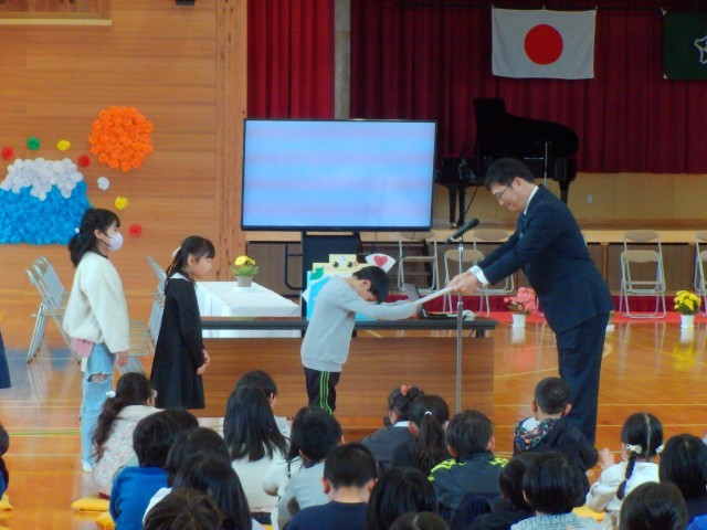 本日は1年の締めくくりとなる修了式。校長より修了証書が手渡され、全員が無事に進級することができました。その後、校長からは1年間の成長について話がありました。画像とともに1年間を振り返り、どの子もどの学年も、自分らしく輝けたことや挑戦できたことを認めてもらいました。話を聴く子どもたちの表情はとても誇らしく、自信に満ち溢れていたように見えました。