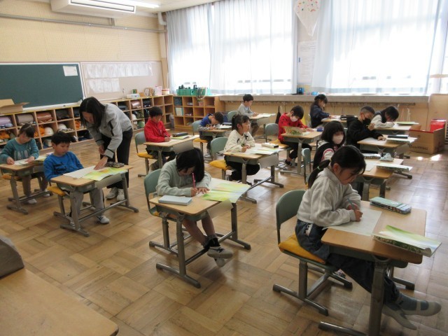 2年生の教室では、プリントをもらった子供たちが名前を書き入れていました。