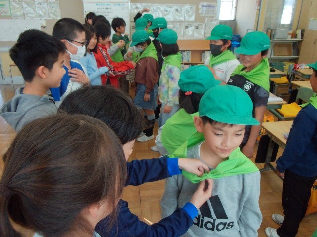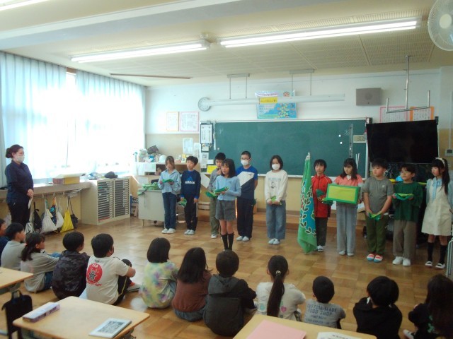 みどりの少年団の引継ぎ式が行われ、5年生から4年生にバトンが引き継がれました。5年生から「大切にしてきた自然、花のお世話をお願いします」と伝えられると、4年生からは「今までありがとうございました。今度は私たちがしっかりと引き継ぎます」と力強く決意が語られました。一人一人に伝統の緑の帽子、スカーフが渡されると、4年生は誇らしそうな表情を浮かべていました。4年生のみなさん、今年一年よろしくお願いします🌺