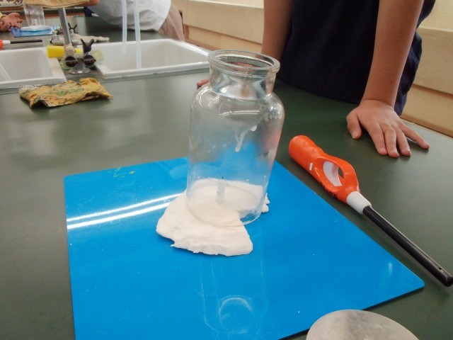 下側に隙間のあいたびんの中でろうそくの火をつけ、蓋をします。火とけむりはどうなるのでしょう?