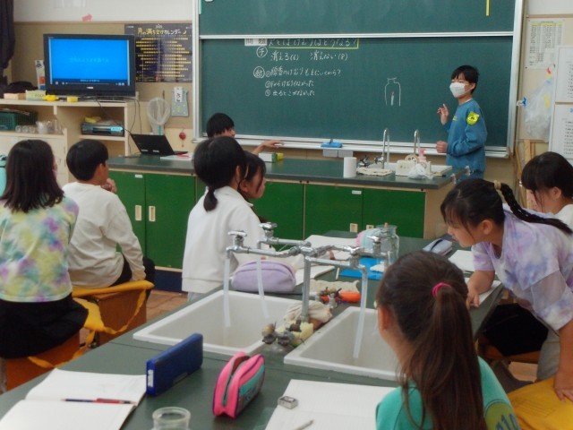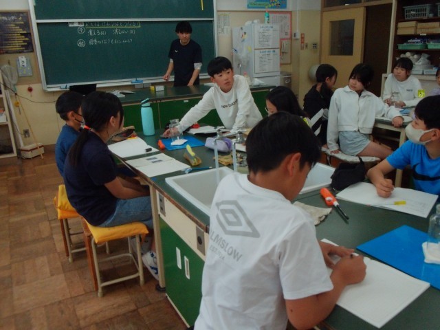 なかなか予測するのが困難な「問い」です。子供たちは予想をした後、実験をしました。写真は、実験後になぜそのような結果になったのかを話し合っている様子です。6年生らしく、根拠をもとに上手に説明をしていました。