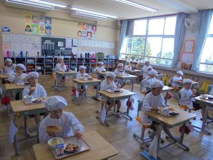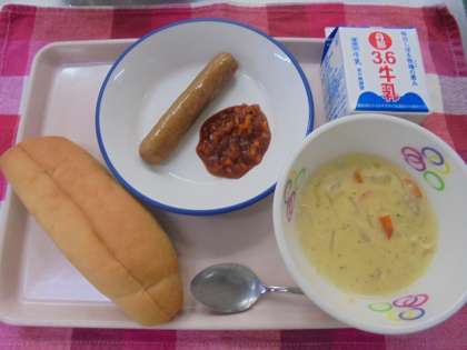 1年生も上手にパンにウインナーを挟み、ソースをかけて食べることができていました!