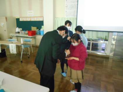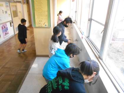続いて、中北薬品の方を招いて、手洗いについて講話をしていただきました。日頃の手洗いでどれぐらいの汚れが落ちているのかを、実際に調べてみました。指のつけ根や手首など、汚れが残っていた人が多かったようです。今日の学習を、これからの生活に生かしていきたいです。