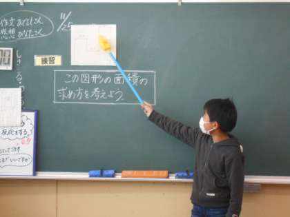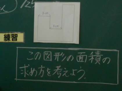 4年生の算数です。面積の学習ですが、写真のように、ちょっと変わった形の面積を求める学習です。