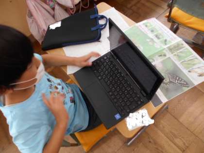 2年生が、調べ学習をしていました♪図鑑にのっていないことは自分でどんどんインターネットで検索しています。紙にぎっしりとまとめが書かれています。すごい!
