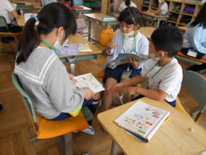 3年生。友達がどう答えるかあらかじめ予想して、英語で質問します。当たっていたら、にこにこ笑顔^^上手にインタビューしています♪