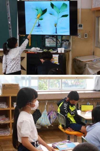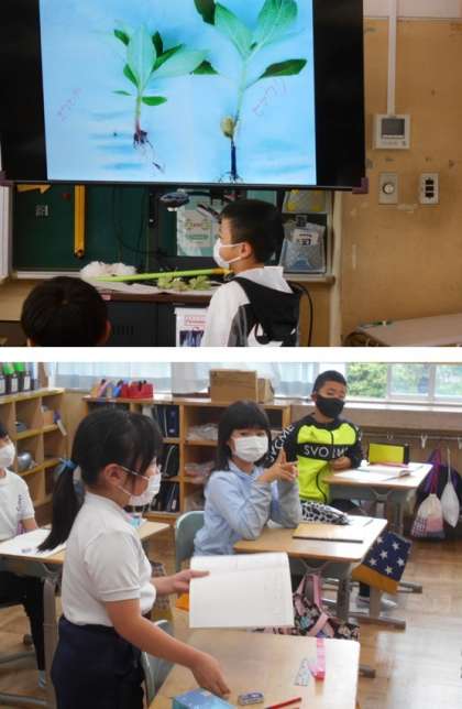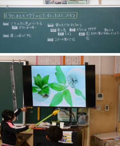 3年生の理科です。ホウセンカとヒマワリを育てています。今日は、その2つの植物の似ているところをさがしてみました。