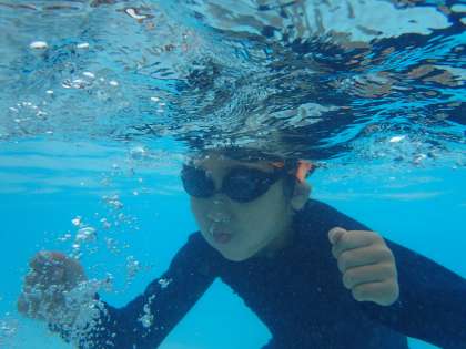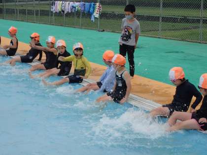 まずは、水慣れ。続いて、頭まで潜れる子は、友だちと水中ジャンケンをしました。