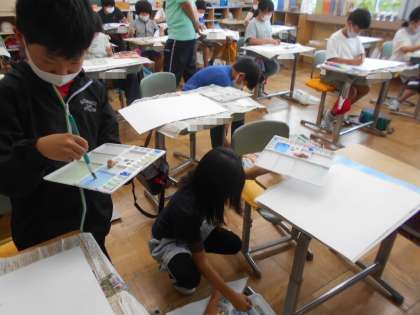 紙をいろいろな形に切っている子。画用紙に色を塗っている子・・・